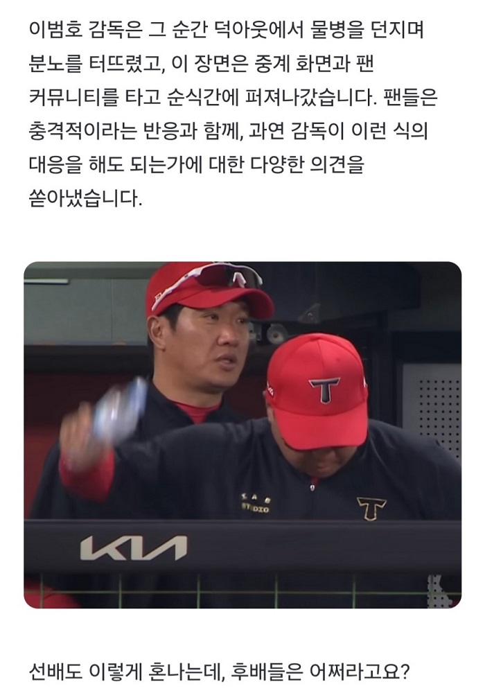 서열이 높다면 높은 고참 선수가 어떡해든 잘 해보려고 행한 play를 실수함에 감독이 그것도 중계방송을 하는 경기에서 성질을 폭발하는 모습은 낮은 서열의 선수, 신인급 선수들은 앞으로 눈치와 질타 때문에 찰나적 빈틈의 작전을 수행하기가 어렵다는 얘기다.